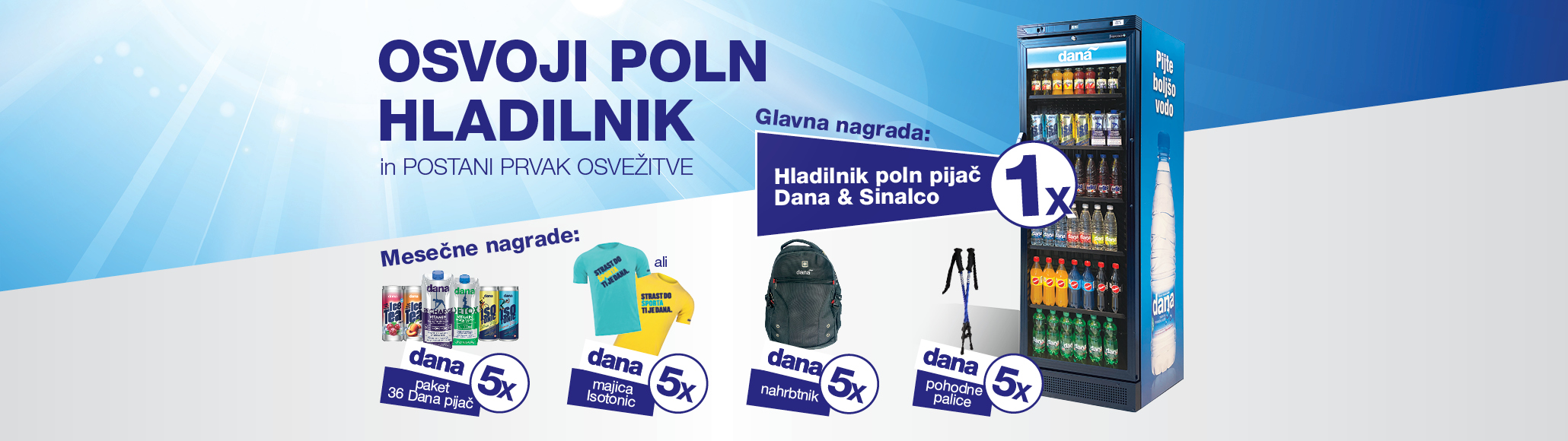 Z malo sreče vas izžrebamo in prejmete glavno nagrado: 1 x Dana hladilnik napolnjen s pijačo Dana in Sinalco. Hkrati sodelujete tudi na treh mesečnih žrebanjih za še druge privlačne nagrade.